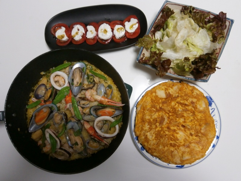 今晩はスペイン料理の定番、パエジャとトルティージャにしました。